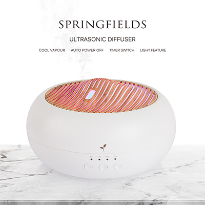 Springfields Ultrasonic Diffuser retains the integrity and purity of essential oils by using ultrasonic vibration, rather than heat, to dispense the therapeutic and ambient benefits of aromatherapy. It works by breaking essential oil molecules down into micro molecules and then diffuses them into the air as negative ions; helping to purify the air. Once the essential oil molecules are dispersed into the atmosphere, they are easily inhaled and absorbed, infusing the room with a pleasant, naturally healthy aroma.